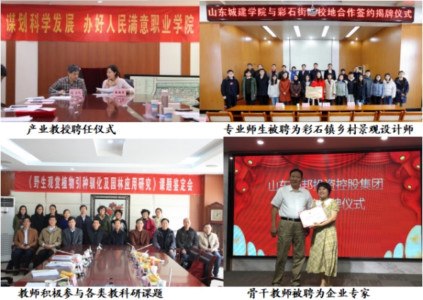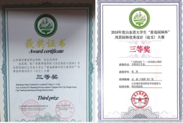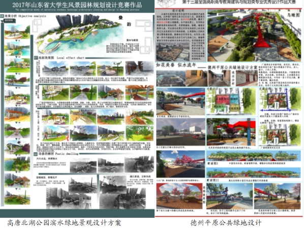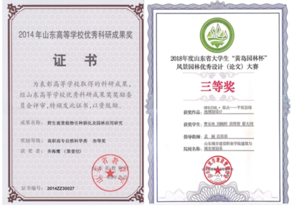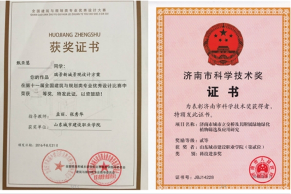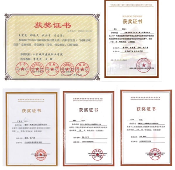 2011年至今,参加全国住房与城乡规划土建类教育教学指导委员会建筑设计类优秀设计大赛获一、二、三等奖30余项;2016年获得济南市科学技术奖二等奖;2017、2019、2020、2021年参加山东省高职园林景观设计与施工技能大赛中获三等奖四项;2022-2023年参加山东省高职园林景观设计与施工技能大赛中获一等奖;2023年参加全国高职园林景观设计与施工技能大赛中获三等奖;2019年参加世界技能大赛——园林景观设计与施工赛项山东省选拔赛获得三等奖;2014、2018年教师分别获山东省教学成果奖三等奖1项,二等奖1项。2018-2023年参加山东省大学生风景园林优秀设计(论文)大赛获三等奖5项、二等奖1项、优秀奖4项;2019年专业学生参加全国职业院校插花与花艺设计技能大赛获得国家级三等奖,在山东省参赛队伍中荣获第一名;2020年专业学生参加山东省职业院校技能大赛花艺赛项获得山东省第一名一等奖;参加全国职业院校技能大赛改革试点赛花艺赛项获得全国第二名国家一等奖;2021年专业学生参加全国职业院校技能大赛花艺赛项获得全国一等奖;专业学生参加山东省职业院校技能大赛花艺赛项获得山东省第一名一等奖;2022专业学生参加山东省职业院校技能大赛花艺赛项获得一等奖;参加全国职业院校技能大赛花艺赛项获得全国二等奖;2023年专业学生参加山东省职业院校技能大赛花艺赛项获得一等奖;参加全国职业院校技能大赛花艺赛项获得全国一等奖;2018-2024年专业师生参加第三十九届、四十届趵突泉金秋菊展插花大赛中获一、二、三等奖及最佳创意奖多项;2023-2024年专业学生参加全国一带一路暨金砖国家技能发展与技术创新大赛——园林景观设计虚拟仿真技能赛项获一等奖1项、二等奖2项、三等奖1项;参加园林植物病虫害防治赛项获三等奖1项。指导教师获优秀指导教师称号;2014年山东省高等学校优秀科研成果奖三等奖;2020年科研项目获2020年度山东省高等学校人文社科奖一等奖;2017-2010年建设山东省精品资源共享课《园林规划设计》《园林绿地养护管理》;2022年专业核心课程《园林规划设计》获山东省职业教育在线精品课程立项;2019-2024年《园林植物景观设计》《风景园林艺术原理》《园林工程计量计价》《名园实测》《生态园林景观设计》课程立项国家专业教学资源库建设项目核心课程;2019年《社区微景观设计与营造》《室内植物景观设计与营造》获山东省教育厅社区教育优秀课程资源;2020-2022年山东省大学生环境艺术创新创意设计大赛获二等奖四项、三等奖五项。教师获优秀指导教师称号;2021年专业学生参加“建行杯”第七届山东省“互联网+”大学生创新创业大赛获铜奖;2022-2024年专业学生参加山东省大学生风景园林优秀设计和山东省技能兴鲁职业技能大赛——山东省园林绿化行业协会第三届花境职业技能竞赛共获一等奖5项、二等奖4项、三等奖5项;专业教师累计出版专业核心课程教材10多部,发表各类学术期刊论文50余篇。