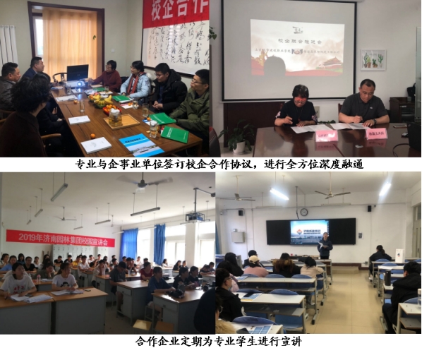 成立园林工程技术专业建设委员会。持续长效与省内多家园林企事业单位围绕人才培养、课程建设、实训条件建设、师资能力提升等方面建立深度合作。分别与济南园林开发建设集团有限公司、山东汇友市政园林集团有限公司、济南园林集团景观设计研究院有限公司、山东四季青生态环境科技集团股份有限公司、北京舜景易道景观设计有限公司济南分公司、山东历城建设集团有限公司等40多家企事业单位签订校企合作协议,为学生实习实训、专业技术技能积累和教师社会服务能力提升提供优秀平台。